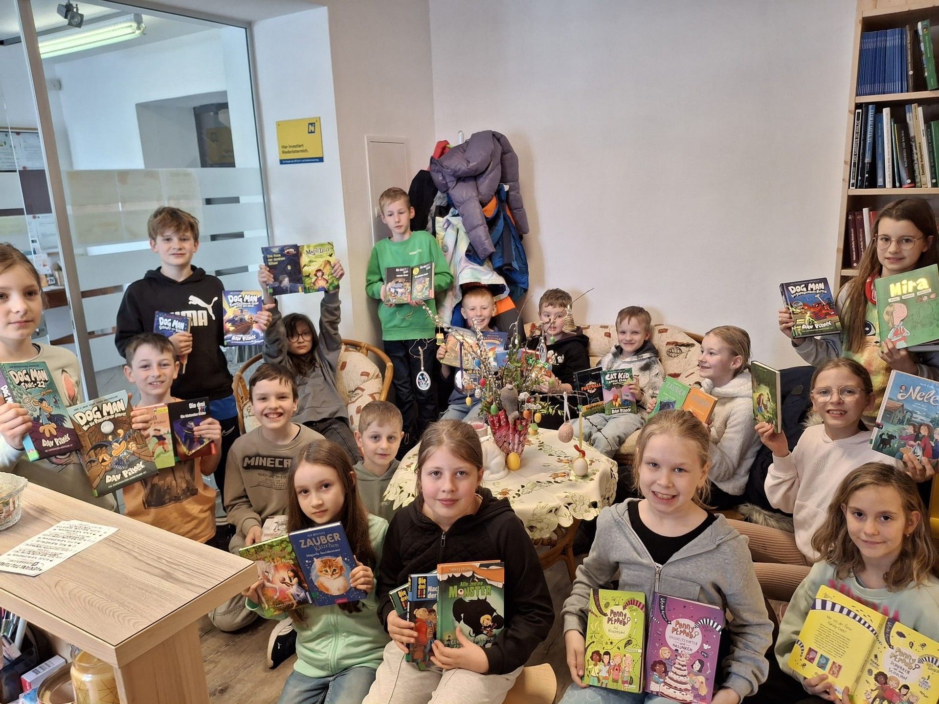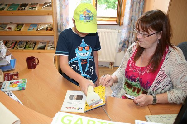 Ehrenamtliche Mitarbeiter der Bibliothek Grafenschlag mit dem Autor. V.l.; Leiterin Brigitte Hochstöger, Vorleser Roman Klementovic, Silvia Hafner-Rosenmaier, Margit Zainzinger, Fay Linda Jussel von Tintenwald, Gabi Hackl und Gabi Kellner.